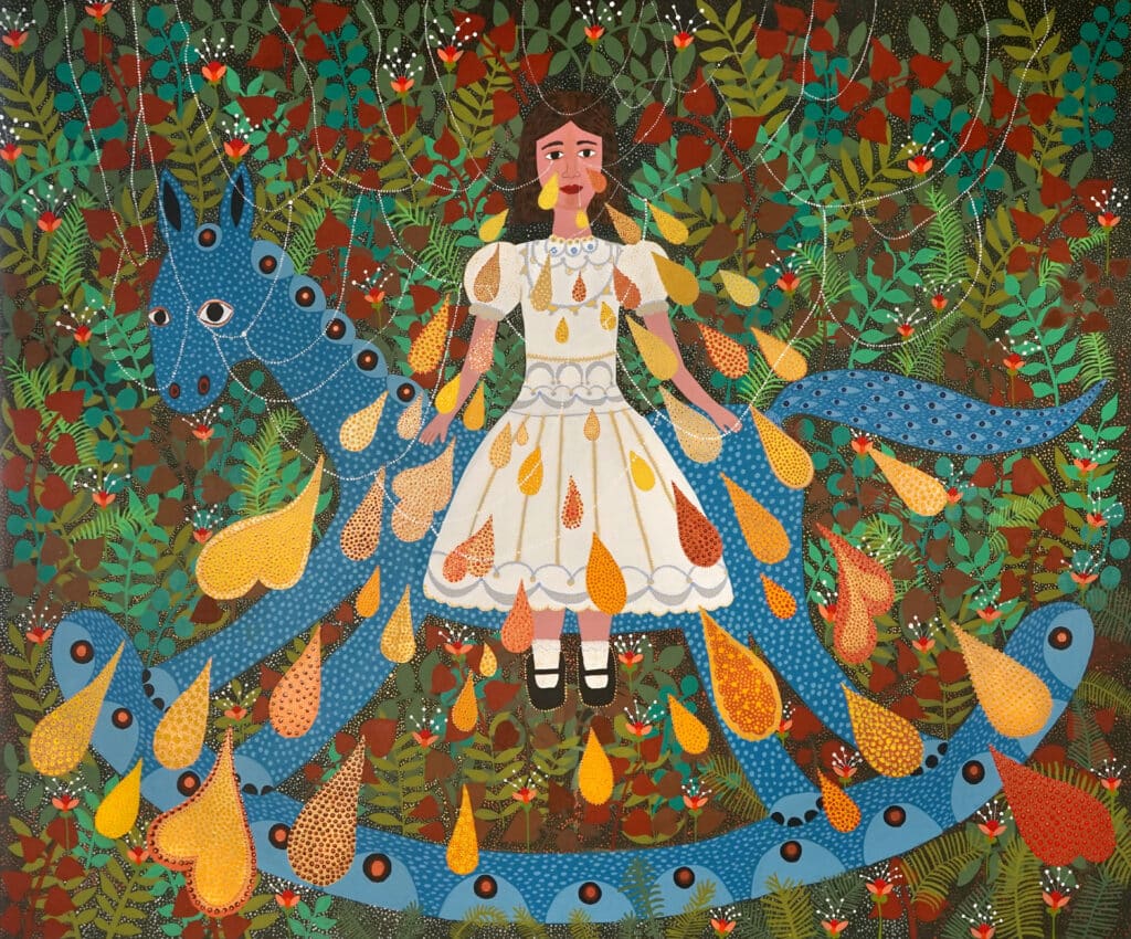 One of his works, Metallic Tears, shows this blending spectacularly. It’s a painting of a young girl, who looks like a doll. Her dress and black Mary Jane shoes borrow from traditional American folk art, as well as 19th century paintings. She sits, facing the viewer, on a blue rocking horse that’s larger than she is, against a background alive with sage and ivy-colored vines dotted with wine-red berries. Her paisley tears flow in giant drops down the painting, two of them morphing into hearts.