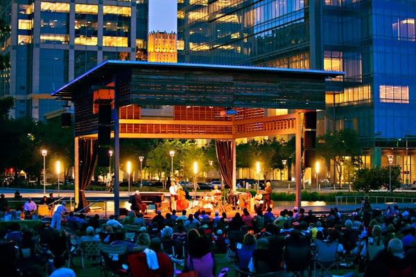 The Anheuser-Busch Stage is a state-of-the-art outdoor concert venue, with audio and lighting systems designed to enhance the unique diversity of Houston’s performing and visual arts, as well as all musical genres. The backdrop of the stage is a magnificent view of Houston’s downtown skyline. The stage faces the Fondren Performance Space, with convenient access from Avenida de las Americas and the George R. Brown Convention Center. The stage can accommodate an oversized movie screen, with projection capabilities for outdoor movies, audio/visual slideshows and presentations, and live feeds.