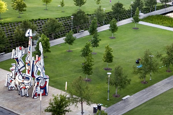 The Lindsey Waterside Landing is a manicured lawn space on the northeast side of the park, bordering on a section of Kinder Lake. The location affords beautiful and tranquil views of the water, in addition to stunning views of Houston’s downtown skyline. The landing is also adjacent to the Monument Au Fantome, a masterpiece of modern art by Jean Dubuffet that was a gift from the Dan Duncan Family.