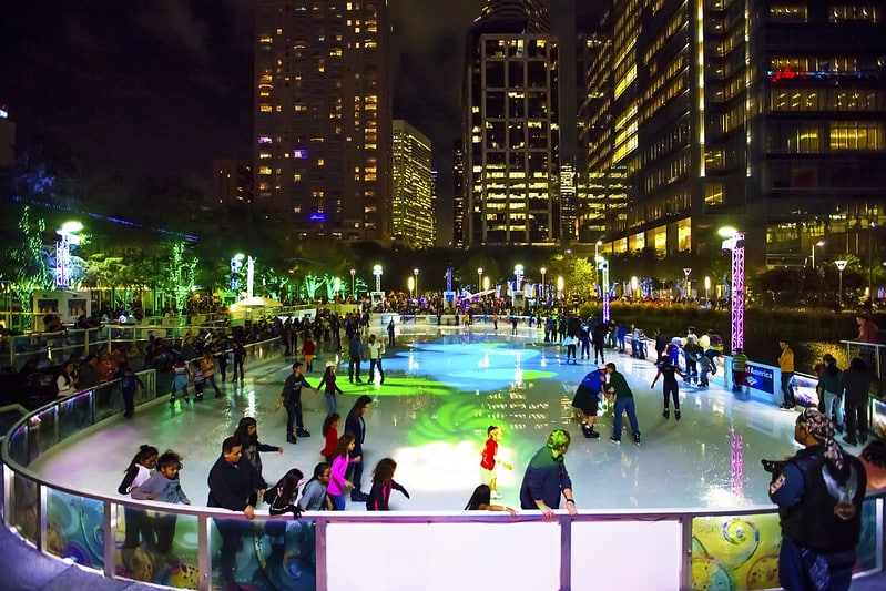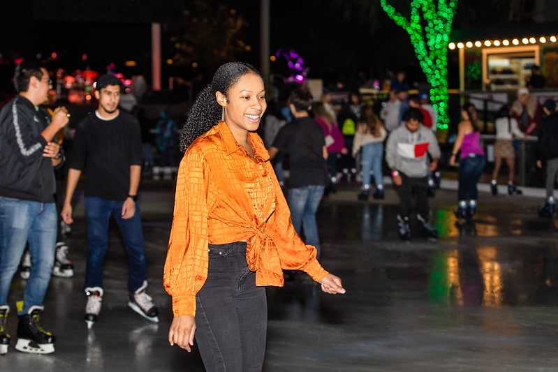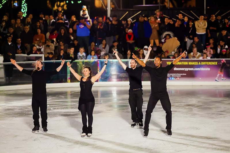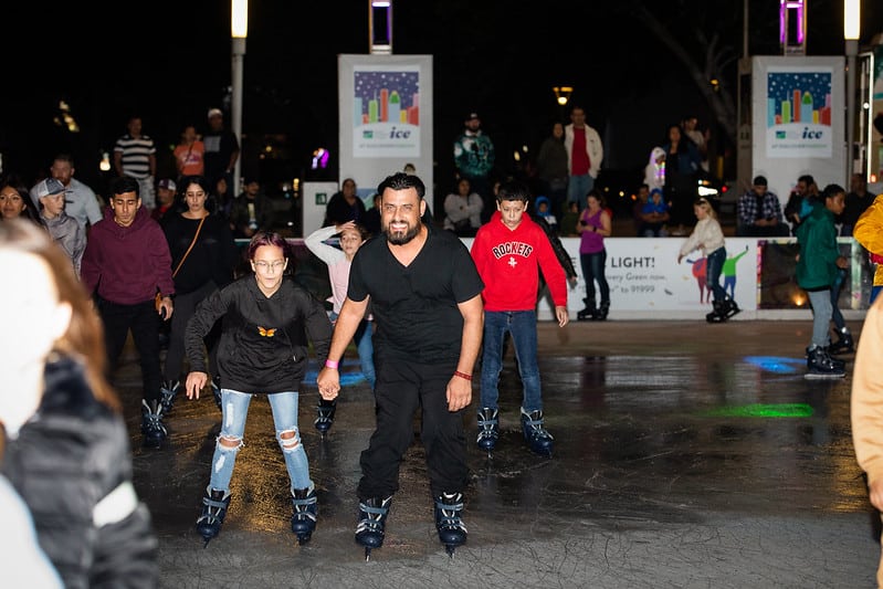 The outdoor skating rink at Discovery Green is run by Ice Rink Events, a Houston-based designer, manufacturer, installer, and operator of ice rinks around the globe. Every winter Kinder Lake transforms into a holiday skating destination. The expanded rink uses equipment that runs on renewable energy and even the ice rink border is made from recycled plastic materials. In the spring, the rink is used as an outdoor roller skating rink.