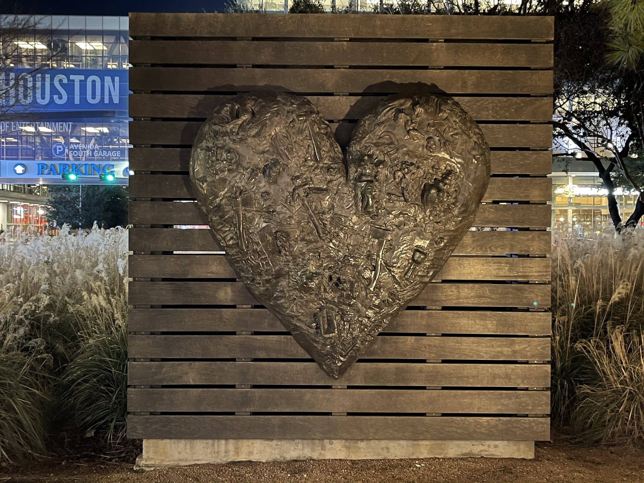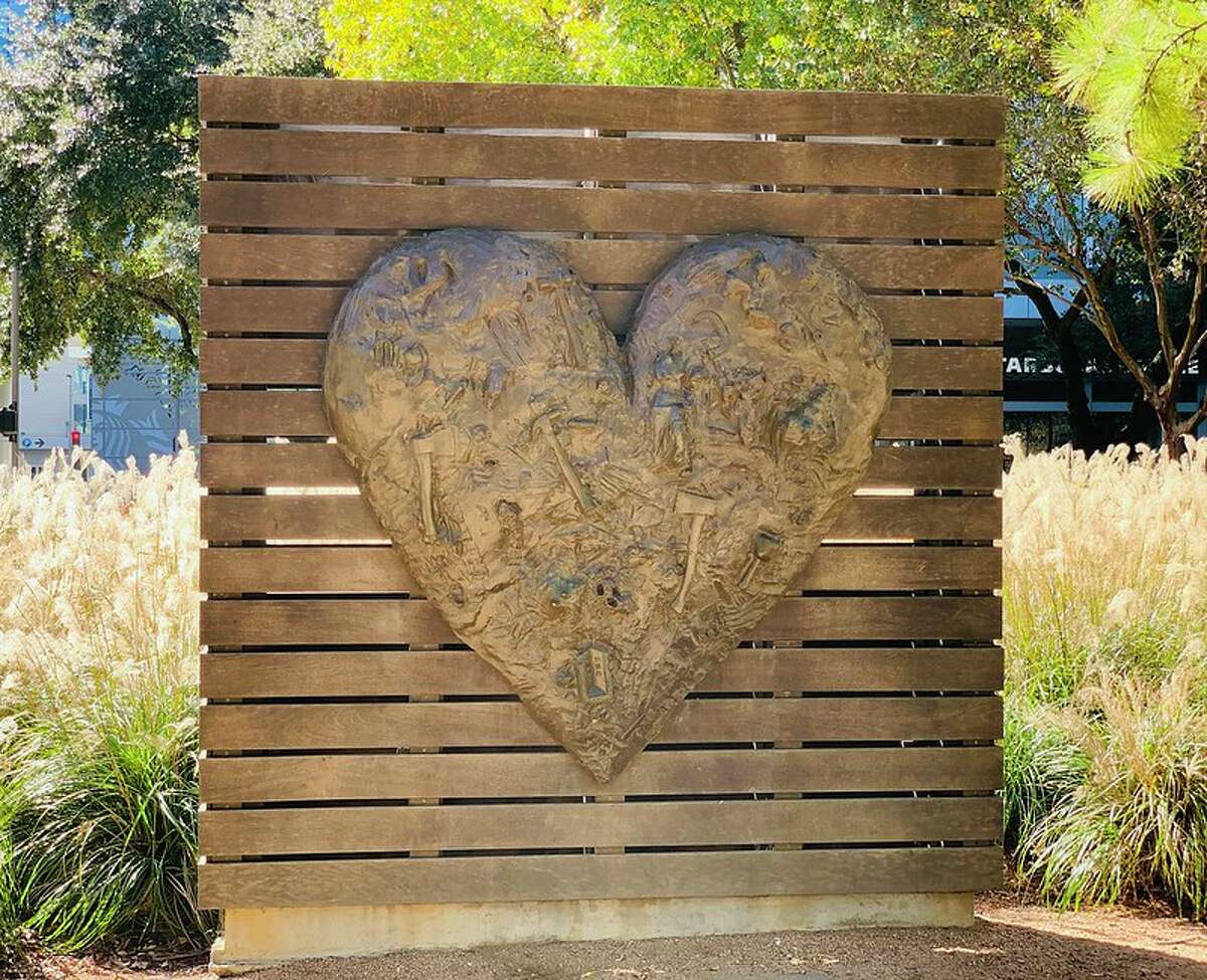 The custom-mounted bronze relief now resides in Maconda’s Grove at Discovery Green. Shaded by mature loblolly pines, this grove is located near the corner of the park closest to Lamar and Avenida De Las Americas. The House (Heart) is one of an edition of three bronze casts created by Dine, with cast two residing in the Tate Modern Museum in London. Associated with the development of Pop art in the early 1960s, Dine frequently affixed everyday objects to his canvases and artwork. The original clay model of The House (Heart) had embedded into it tools and objects like hammers, axes, a brick, a spanner and mallet. Dine stated in Jim Dine: Five Themes tools are “the link with our past, the human past, the hand.”