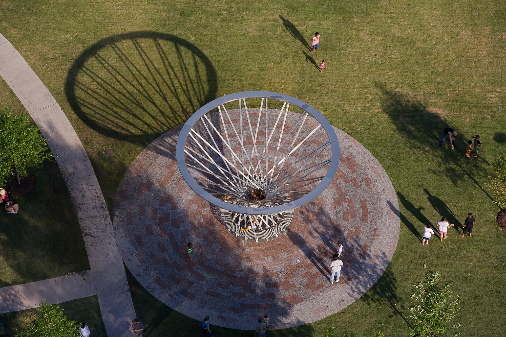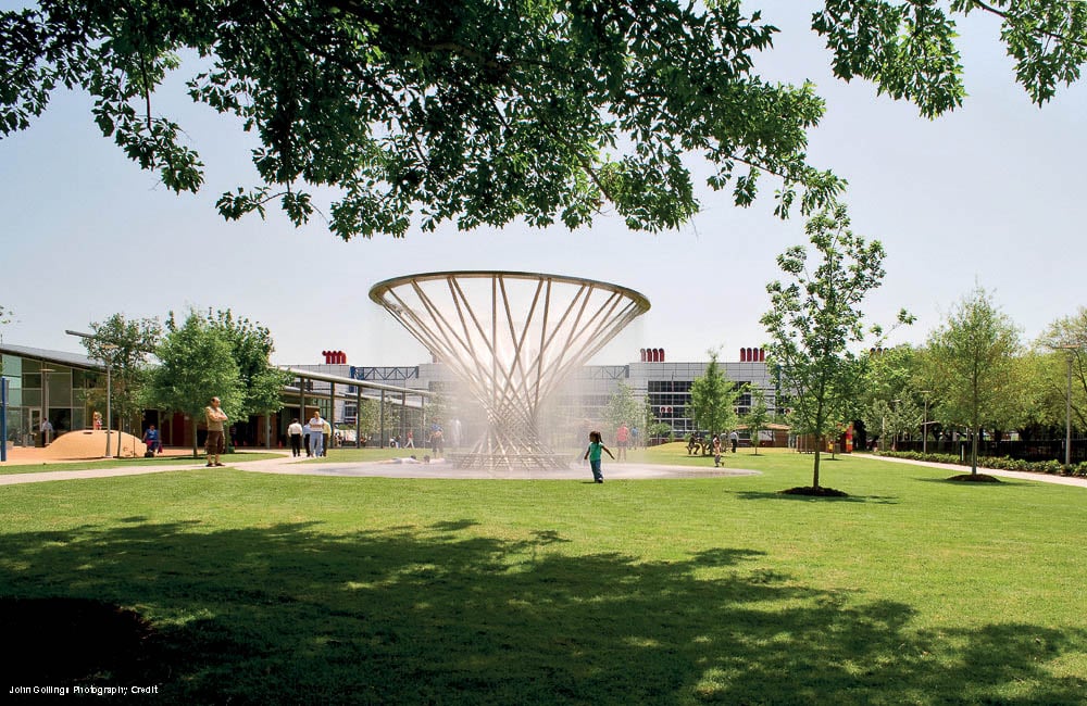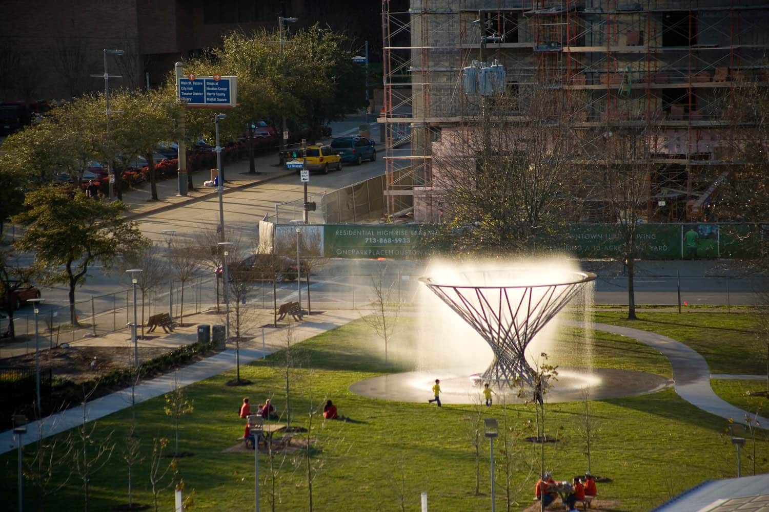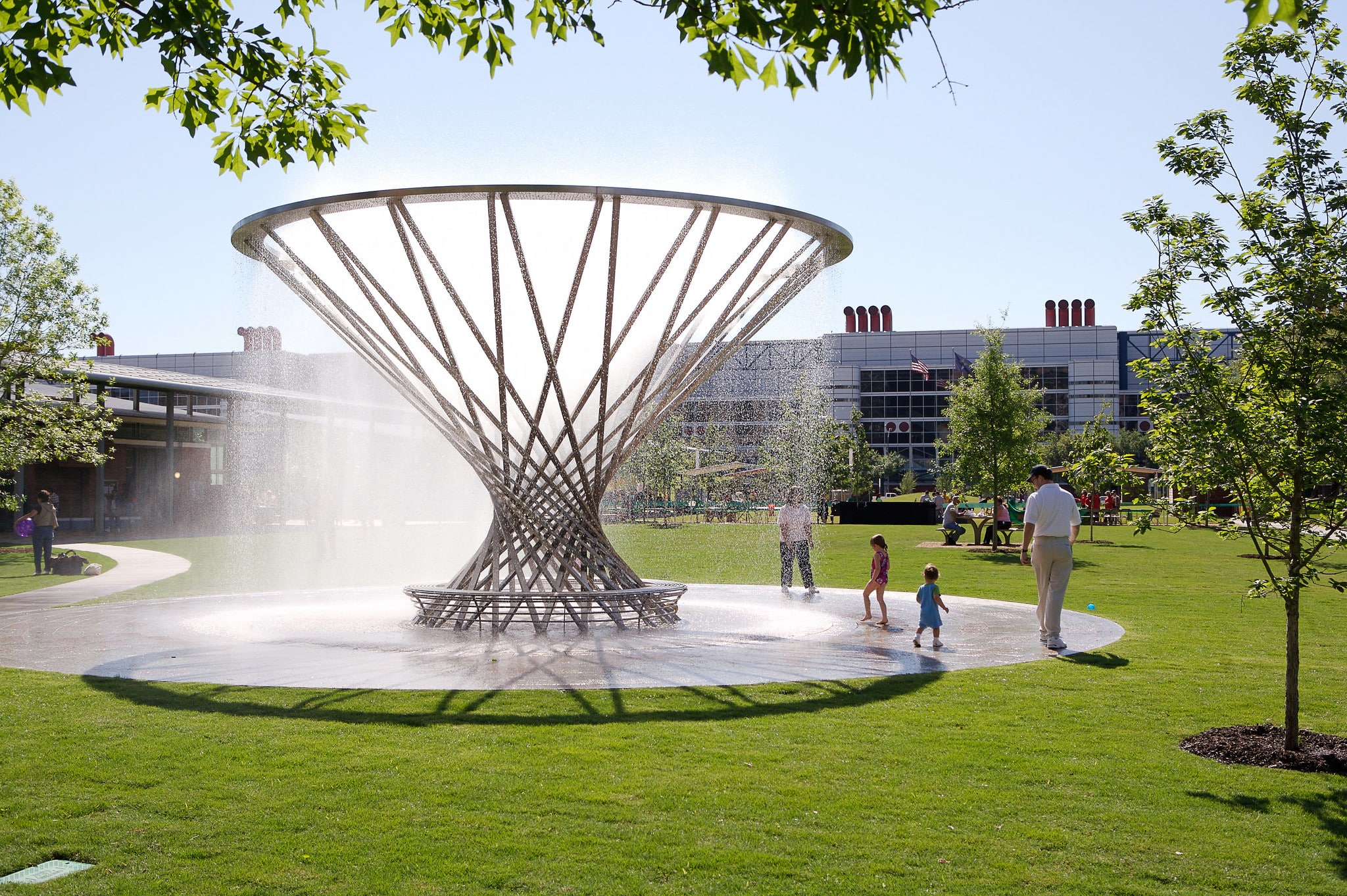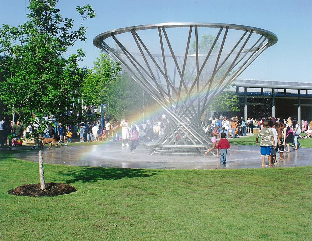 This focal point of the Sarofim Picnic Lawn is by San Francisco artist Doug Hollis. Hollis likes to work with natural phenomena: in this case – water and mist.