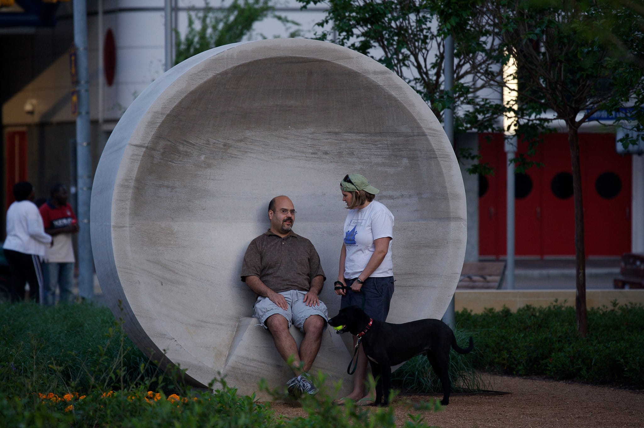 With sound in mind, Doug Hollis created these two stone sculptures out of Alabama limestone. Their concave interiors focus sound waves, allowing you to speak very softly and be heard in the other vessel seventy feet away.