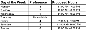 - Please state your guaranteed days and hours of operation. Rank your preferred days from 1 (most desired) to 7 (least desired).