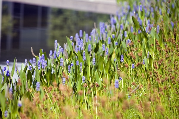 At the eastern end of Kinder Lake, these water gardens contain Louisiana Iris, Yellow Flag Iris, Pickerel Rush, Variegated Water Celery, Lizard’s Tail and Arrow Arum. Water Lilies float further out in the water.
